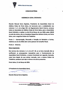 Ricardo Manuel Serra Baptista, Presidente da Assembleia Geral do Atlético Clube de Porto Salvo, de harmonia com o estabelecido nos números 1 e 2…
