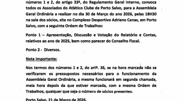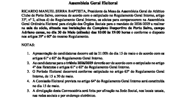 O Presidente da Assembleia Geral do Atlético Clube de Porto Salvo tem a honra de convidar todos os sócios e a população de Porto…